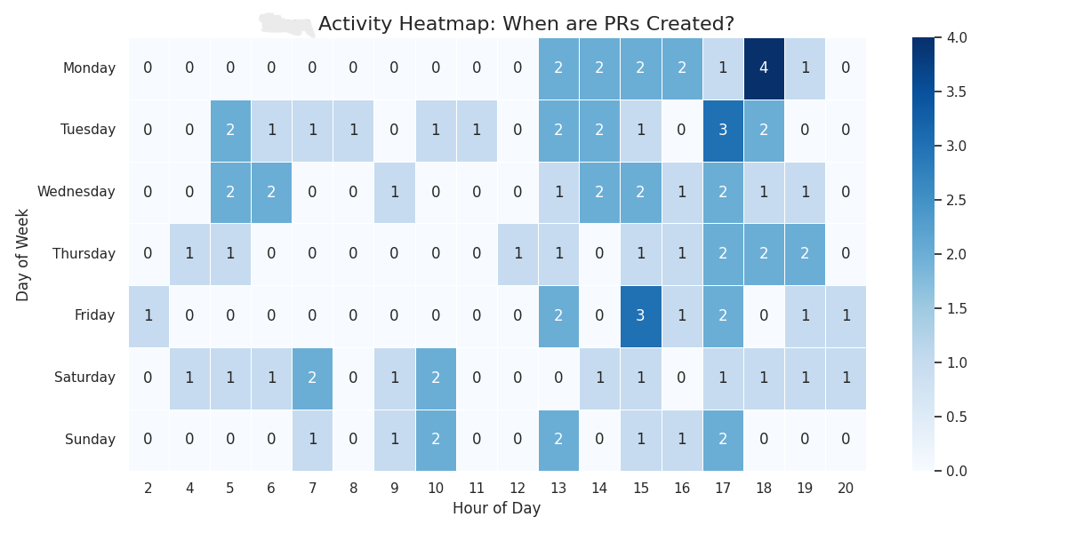 To understand when contributors (including myself) tended to open PRs, I also generated a day-of-week × hour-of-day activity heatmap. The pattern shows that most PRs were created during weekday afternoons and early evenings, aligning with typical contributor availability and maintainer review windows.