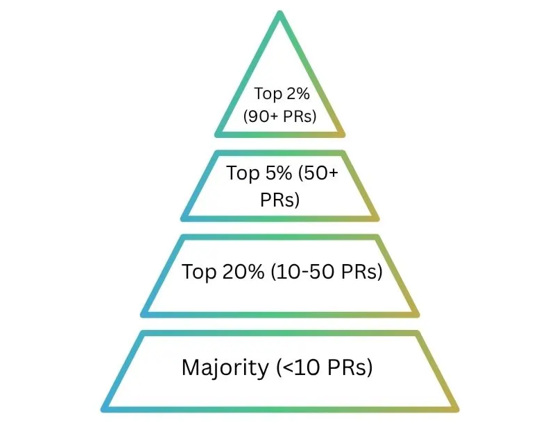 The contribution pyramid visualizes the distribution of contributors based on lifetime pull requests across open-source projects. The majority of contributors submit fewer than 10 PRs, forming the broad base of the pyramid. As contribution volume increases, the number of individuals sharply decreases, roughly 20% of contributors have 10–50 PRs, only ~5% exceed 50 PRs and fewer than 2% surpass 90 PRs.