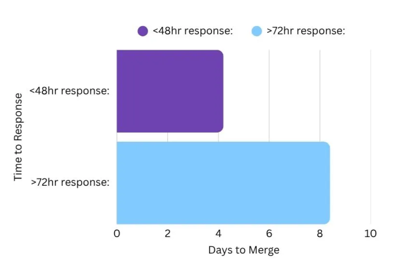 Across the data, PRs with a response time under 48 hours merged 4.2 days faster than PRs where contributors responded after 72 hours. Staying engaged within the first two days keeps your PR visible and signals intent.