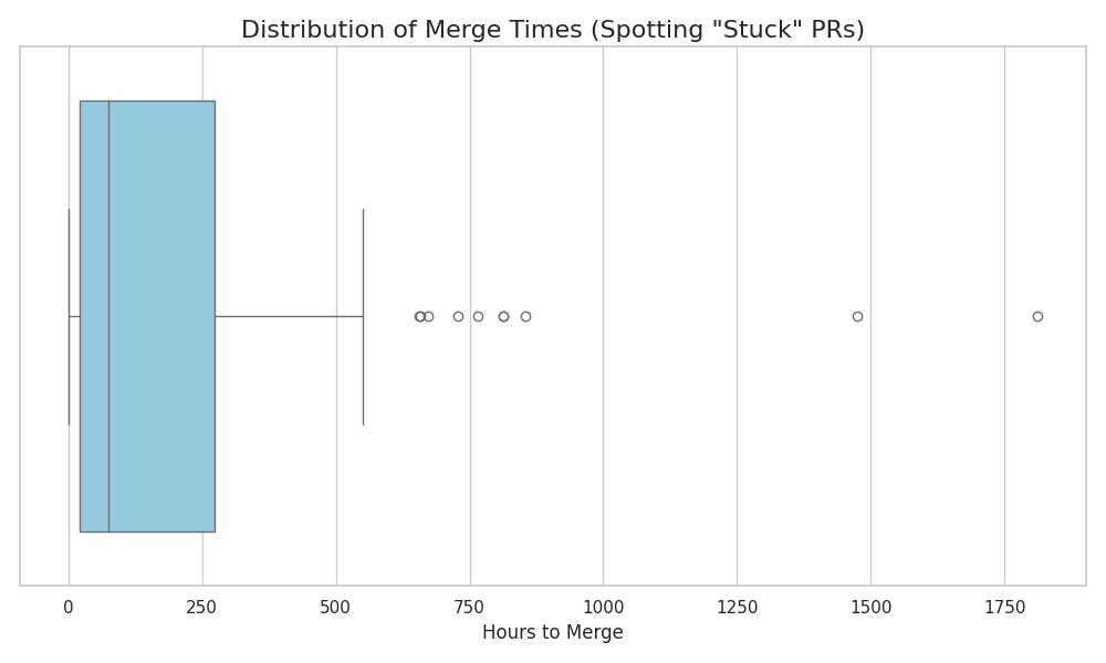 If we look at the box plot showing the distribution of merge times, we see a clear pattern: PRs that follow these practices consistently merge faster, while PRs having large, multi-scope or under-discussed contributions take significantly longer and sometimes become “stuck” for weeks or months.