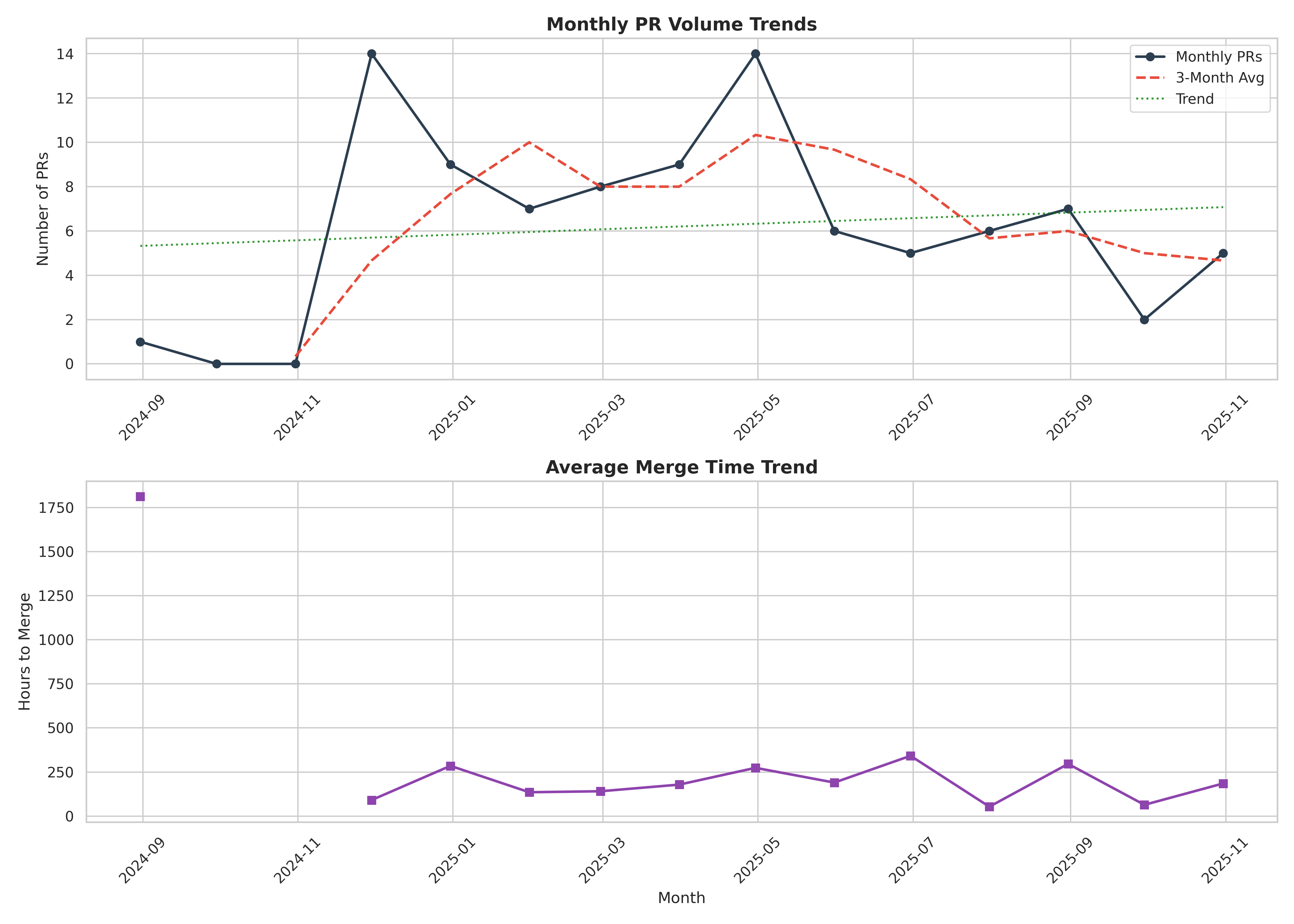 One of the first patterns comes from the monthly PR volume, which provides a high-level view of project activity over time. The visualization below shows how merged PRs fluctuate month-to-month, highlighting periods of higher contributor engagement (such as November 2024 and April 2025) and quieter phases (such as August 2024 or September 2025). These variations help understand review load, maintainer bandwidth and seasonal contribution patterns before diving into more granular metrics.